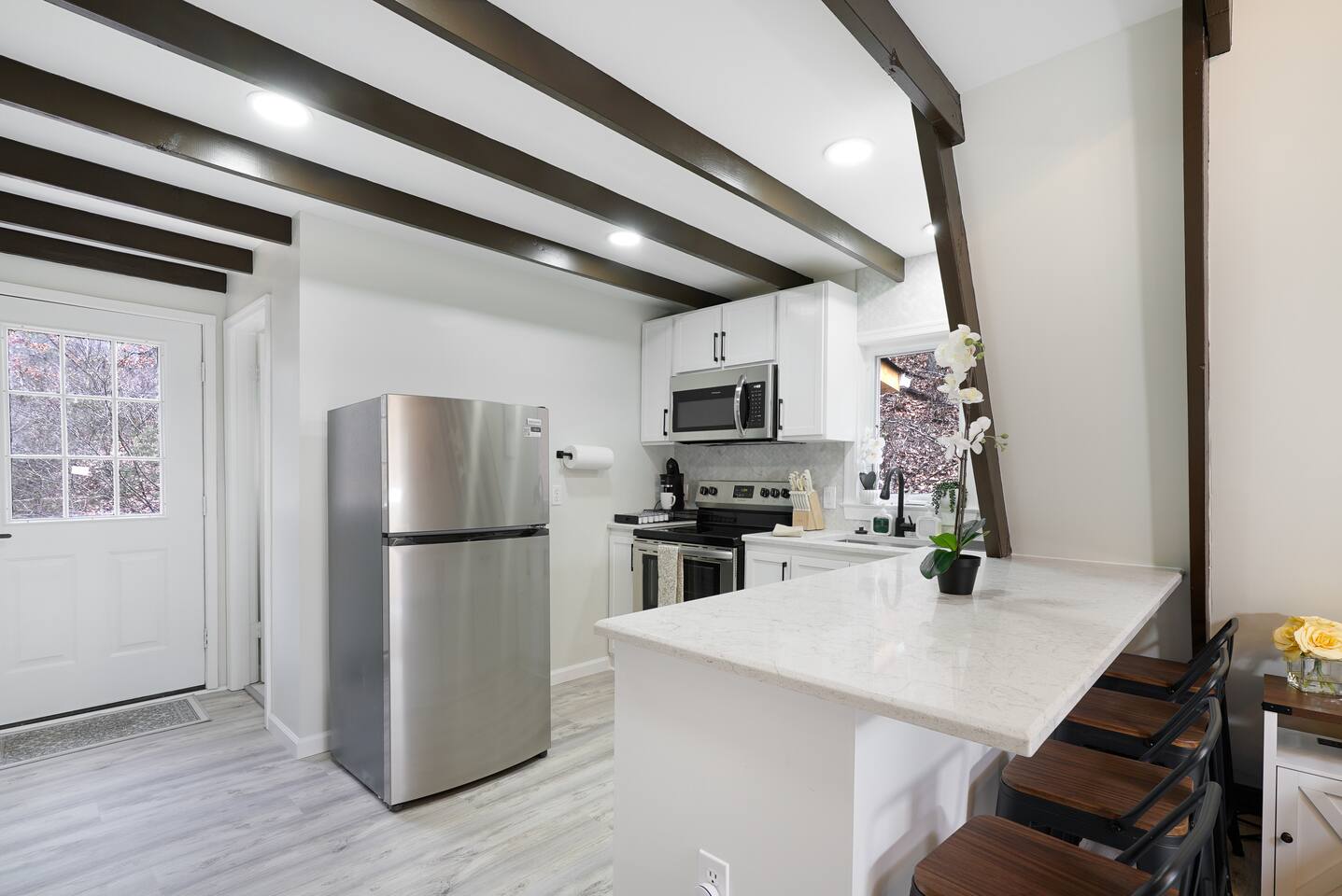 This cozy haven accommodates up to four guests across one bedroom and a loft. There is a fully stocked kitchen for your culinary endeavors and a full bathroom with a rain shower to rinse your troubles away. If you're looking to unplug from the hustle and bustle, then you've found the right place! You'll even be lucky to find cell signal here, but fear not! We provide a blazing fast 600mbps internet connection to keep you connected. Outdoors, gather around the fire pit for captivating conversations as you roast s'mores, or showcase your grilling skills on the BBQ. If you're lucky to have had some recent rain before your stay, you'll hear the soothing sounds of the babbling creek that runs right next to the cabin. Perfect as you soak in the outdoor hot tub with the jets massaging your back! Inside, the charm continues with a wood-burning stove to keep you warm and a 55-inch smart TV with all the popular apps like Netflix, Hulu, and Amazon Video. The cabin is located in Mount Jackson, VA, 18 minutes from Bryce Resort, 16 minutes from Lake Laura, 20 minutes to Cave Ridge Vineyards, and 22 minutes from Wolf Gap Vineyard. Whether you're seeking adventure on the nearby slopes or simply craving a break from the daily routine, our mountain cabin promises a perfect blend of seclusion and modern comfort. Book now and experience the magic of this tranquil escape.