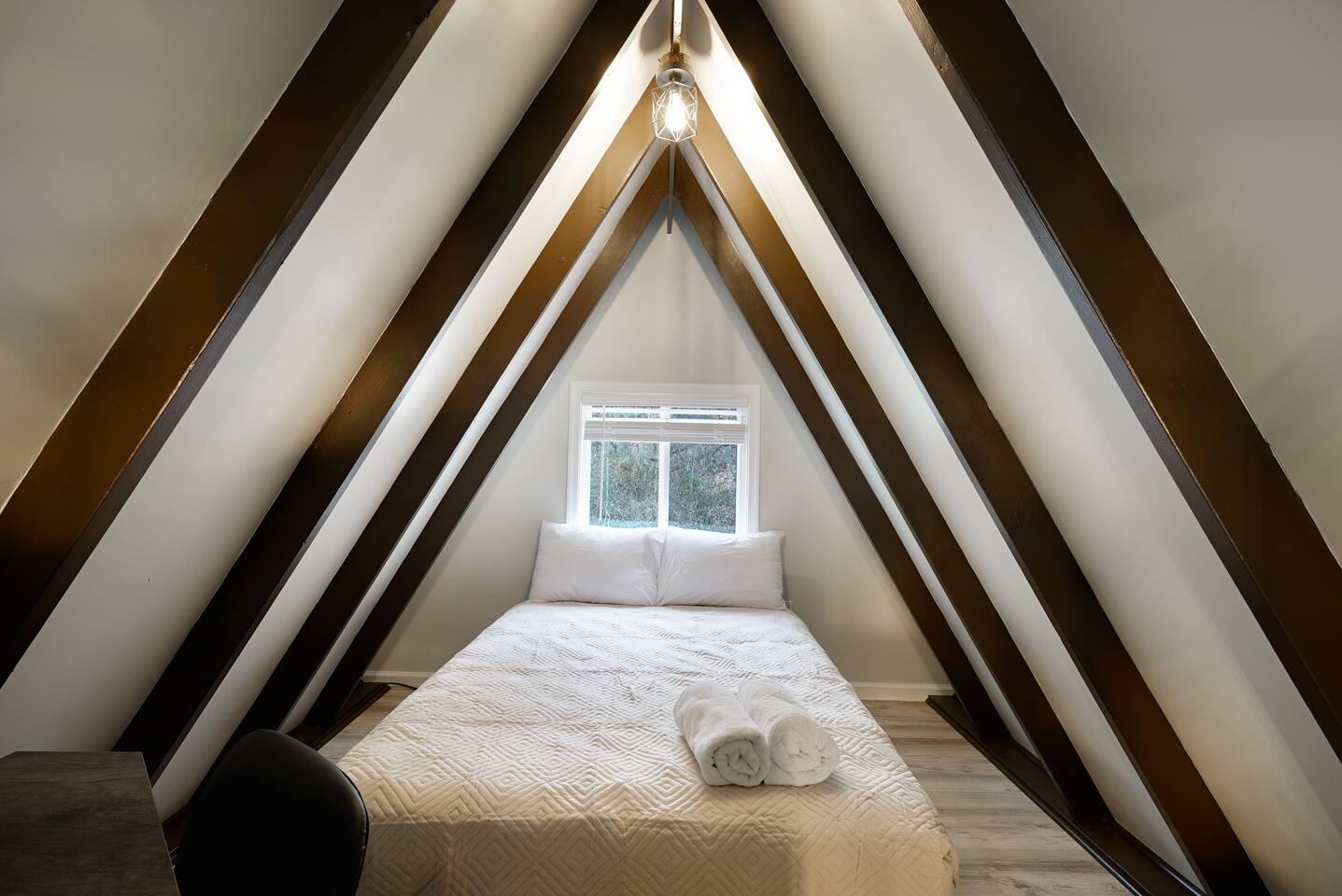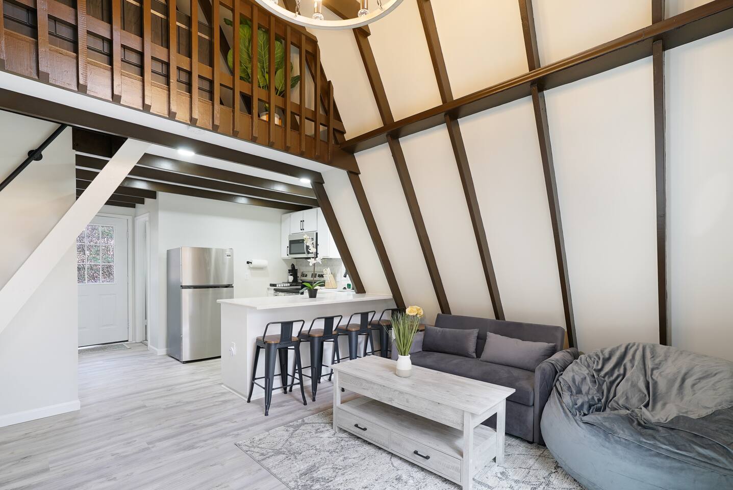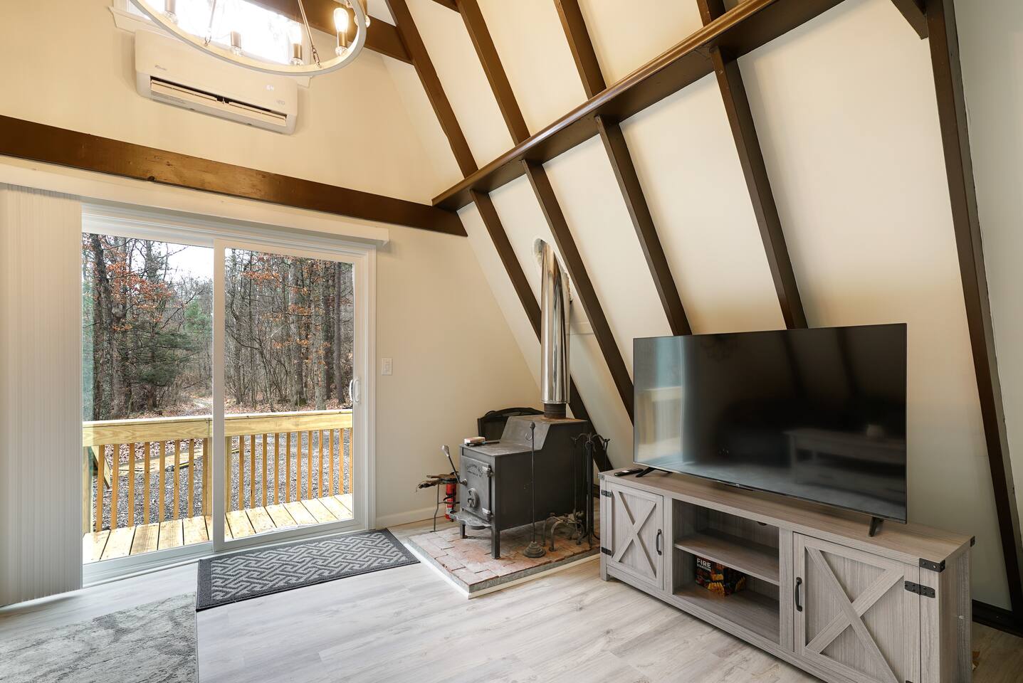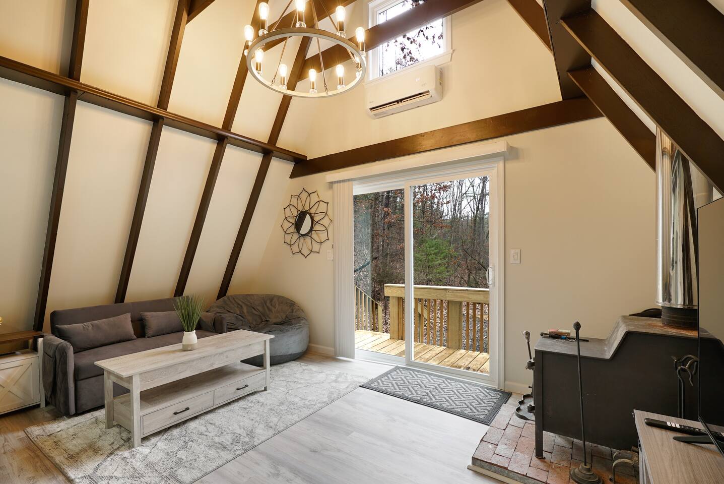Escape to our secluded fully renovated A-frame nestled in the mountain range. Unplug and unwind as you surround yourself in nature, while enjoying modern comforts with fast internet, a full kitchen, fire pit, BBQ grill, a 55 inch smart TV, and a hot tub! The cabin accommodates up to four with one bedroom, a loft, and full bathroom. Bryce resort, Lake Laura, and several wineries are just a short drive away, making it ideal for a romantic getaway or a serene escape with family or friends.